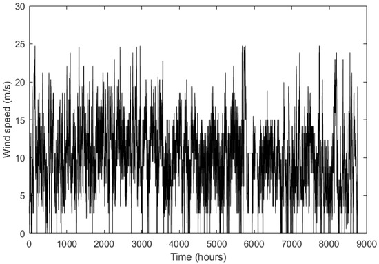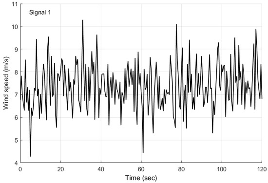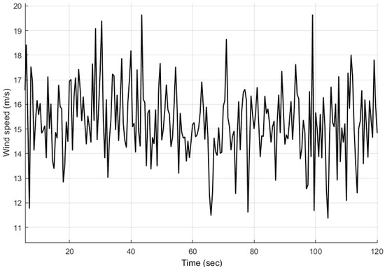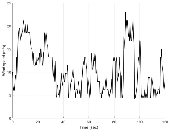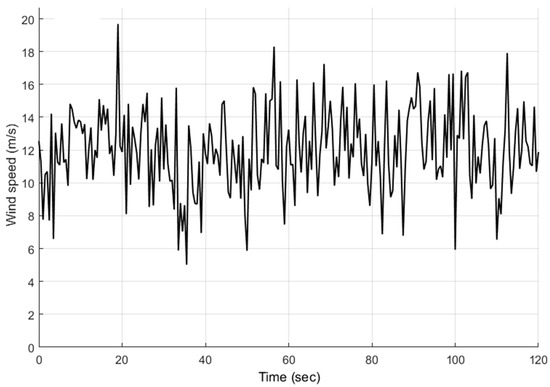 Figure 13. These hourly wind speed values are statistically analyzed to obtain the wind speed series between the successive seconds using Gaussian distribution given by Equation (74). The mean wind speed and the standard deviation used for the Gaussian distribution are 10.38 and three. The wind speed generated using the Gaussian distribution, which is given as disturbance input to the wind turbine model, is shown in