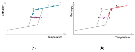 Figure 2b). After completion of the phase change, the material again accumulates heat only in a sensible way (curve 5–1) while remaining in the heating curve state.