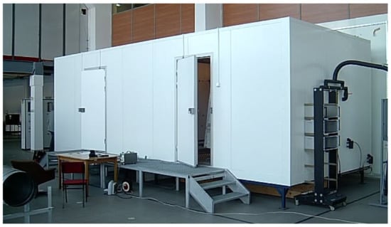 Figure 3. A wall, located between the warm and cold chamber, was made of 15 cm expanded polystyrene covered with the standard gypsum panel on the warm side. Two material samples were glued to the gypsum panel. One of them was a modified gypsum panel (50 × 60 cm) containing 30% by mass of PCM Micronal. The second one was a reference standard gypsum panel of the same size and thickness (12.5 mm) as the PCM panel. The principle of the presented research was based on a comparison of surface temperature fluctuations and energy accumulation in the PCM and the reference standard samples. In this way, the authors wanted to examine the efficiency of the added PCM wall cladding as a form of overheating protection in a hot summer environment.
