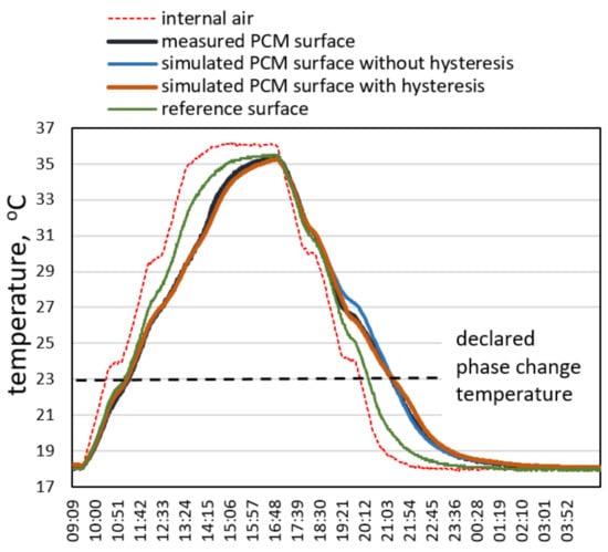 As could be expected, significant discrepancies may be observed during the cooling stage, when the solidification process starts. Within the wide range of phase change, but still, before the phase change temperature declared by the producer (23 ℃) was reached, the model without hysteresis (orange curve) showed a surface temperature higher than the other models due to the single characteristic curve. The new model that takes into account the effect of hysteresis closely followed the measured values. Below the phase change temperature, this relationship was reversed.