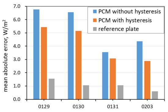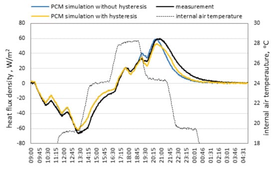 Figure 5 shows the heat flux values on the internal surface of the PCM board obtained from measurements and computer simulations. One simulation was conducted on the model without taking into account phase change hysteresis and the second one with this effect. The cycle begins with the discharge phase of the wall’s thermal capacity (negative flux value). Then, as a result of the internal temperature increase in the tested space, heat flux released from the wall decreased, and then the process of recharging (plus flux value) began. The significant differences between both simulation models may be noticed in the second phase of the research cycle, especially in cooling mode. The maximum instantaneous heat flux value was high and equal to 62 W/m