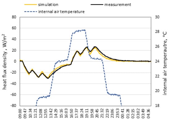 Figure 6 shows the results of measurement and simulation of heat flux on the internal surface of the reference gypsum board. The heat exchange on the surface of the standard panel took place according to a similar scenario as before, but the instantaneous heat flux values were definitely lower. In the case of material without phase change, the graph obtained from the simulation was very close to the measurement results. The maximum momentary heat flux value was, in this case, equal to 32 W/m