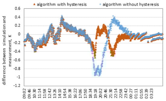 32]. Unfortunately, the hysteresis algorithm was only briefly highlighted in this paper, and the authors’ input data was not presented. The simulation results were compared against experimental data obtained from the small-scale dynamic tests performed with the heat-flow apparatus. It was expected that a new algorithm that enables modelling of hysteresis would closely follow the real mode of phase change and thus the precision of the PCM simulations. Goia et al. confirmed these expectations stating that the numerical results were significantly better than those obtained with more conventional models. However, in the case of an incomplete phase change of PCM, the obtained results were regarded as ‘questionable’.