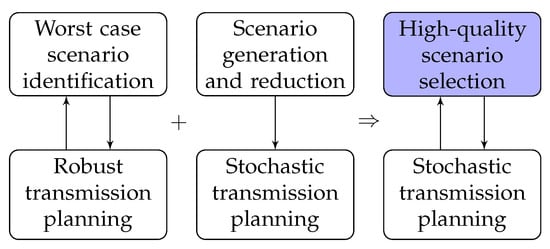 An alternative approach is to use an iterative stochastic TEP model, which attempts to combine the advantages of robust and stochastic TEP approaches and to overcome their limitations. A major limitation of the stochastic TEP approach with scenario generation and reduction is the assumption that the set of selected scenarios will be a good representation of the whole set of scenarios for all transmission plans. This is analogous to identifying one scenario as the “worst case scenario” for all transmission plans in the robust TEP approach. The iterative model in robust TEP acknowledges the need for re-identifying a worst case scenario for each new transmission plan, until the pool of worst case scenarios is sufficiently inclusive of all worst case scenarios. Similarly, the iterative stochastic TEP model re-identifies a new set of high-quality scenarios for each new transmission plan until the pool of high-quality scenarios is sufficiently representative of the whole set of scenarios. A formal definition of high-quality scenarios is given in Section 2.2. Figure 1 highlights the conceptual differences among robust TEP, stochastic TEP, and the iterative stochastic TEP. The scope of this paper is the highlighted component for selecting high-quality scenarios.