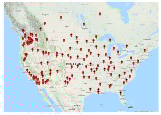 We used the same dataset for the U.S. Eastern and Western Interconnections as used in [] with some modifications. The dataset contained 169 buses, 730 transmission lines, 1640 existing generators, and 1568 candidate generators, representing the transmission infrastructures of the North American power grid. The locations of the 169 buses are shown in Figure 3. Demand for each year was divided into 19 load blocks. There were 60 generation technologies and fuel types, including coal, gas, oil, nuclear, hydro, geothermal, biomass, wind, and solar. Approximately 30% of existing generation capacity was renewable, and this ratio was required to increase by 1% each year, so that it would reach 45% by the end of year 15. One million demand and fuel cost elements of the scenarios were randomly generated with an average 1% annual growth rate for both. All algorithms were implemented in MATLAB [], and to solve the models, we used MATLAB and the TOMLAB interface [] to call CPLEX V.12 [], used as the mixed integer linear programming solver.