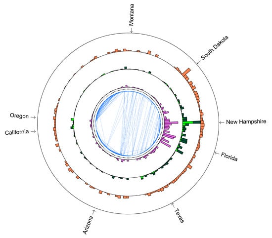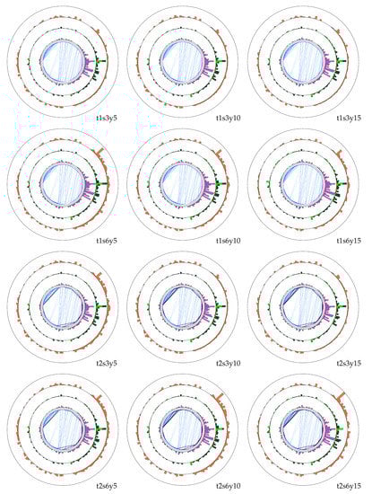 We designed a circular figure to visualize the status of the power system, as shown in Figure 4, which shows the status of the system in Year 0. All buses are represented by black dots and arranged in a circle according to their bus numbers from # 1 at the three o’clock position to # 169 in a clockwise direction. The blue lines inside this circle represent transmission lines that connect buses. Due to the circular arrangement of the dots, the lengths of the line segments in the figure are not proportional to the actual lengths of the transmission lines. The first layer outside the buses represents demand, with the lengths of the purple bars being proportional to the loads. Dark purple was used to indicate load shedding. The second layer represents generation capacity, with the lengths of the green bars being proportional to the generation capacity. Renewable and nonrenewable generation capacities are differentiated with light green and dark green colors, respectively. The third layer represents fuel costs, with the lengths of the orange bars being proportional to the average fuel cost for the generators at the associated buses. At the price of distorted geographical locations of the buses, this figure presents all three elements (demand, generation, and fuel cost) of scenarios considered in this study, allowing the decision maker to have an overview of the system status at once.