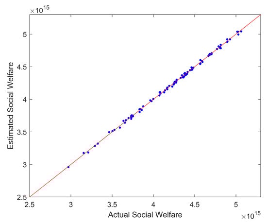 The algorithm for social welfare estimation from Section 3.2 was used in Step 2 of the algorithm for high-quality scenario selection. It took approximately 10 min to calculate the actual social welfare for one scenario. Using a termination criterion as for the training scenarios, the algorithm finished after calculating the actual social welfare for 50 scenarios (in approximately 8 h), which would have taken 19 years for the whole set of one million scenarios. To validate the quality of social welfare estimation, we calculated the actual social welfare for 100 random scenarios that were not used in the training set using Algorithm 1. Figure 5 compares the estimated and actual social welfare of these 100 scenarios, and the minimum, mean, and maximum of were 0.00%, 0.35%, and 0.95%, respectively, for these 100 scenarios.