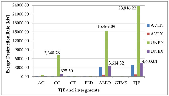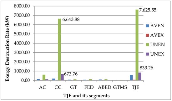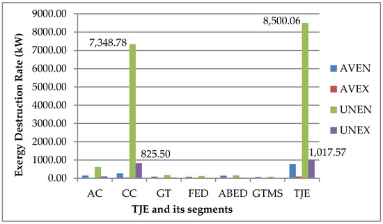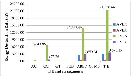 As per exergy analysis, the efficiency of the system and its segments are considered by their place, source and size with the maximum exergy destruction [44]. In other words, exergy is a description of a utilizable work that can be obtained from the present capacity of a gas turbine system. With this scope, the CC and ABED segments are the main components, which have significant effects in terms of exergetic efficiency due to the utmost exergy destructions.