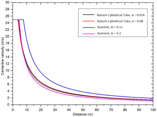 From these equations, the jet fan centerline velocity can be calculated, as shown in the Figure 2, with the supply velocity at 25 m/s, and the side length of the square duct at 0.91 m.
