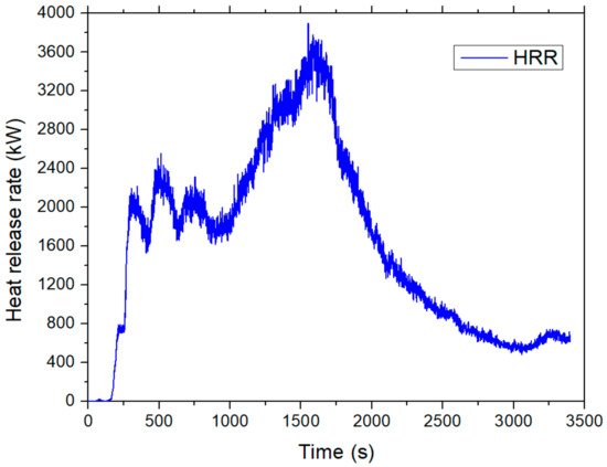 In this study, the heat release rate was obtained from our experimental study; one car was assumed to be fired in the tunnel. The maximum heat release rate was 3896 kW at 1551 seconds as shown below Figure 3. Besides, the heat release rate was around 6 MW, and 16 MW for two vehicles [41] and truck fires, respectively.