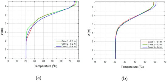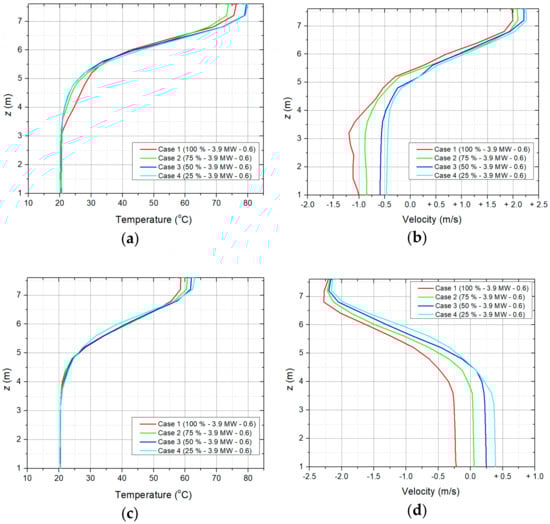 In Figure 12a, at the upper part, the lower the aspect ratio was, the larger the temperature was. When the aspect ratio increased, the velocity increased. This is because the width of the tunnel decreased when increasing the aspect ratio. In the lower part, as all flow was air, the absolute velocity value of case 1 (lowest aspect ratio) was lower than in other cases.