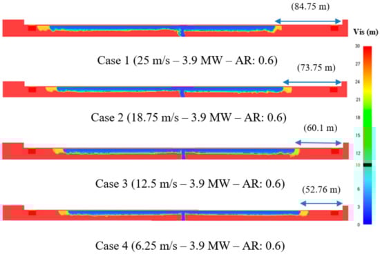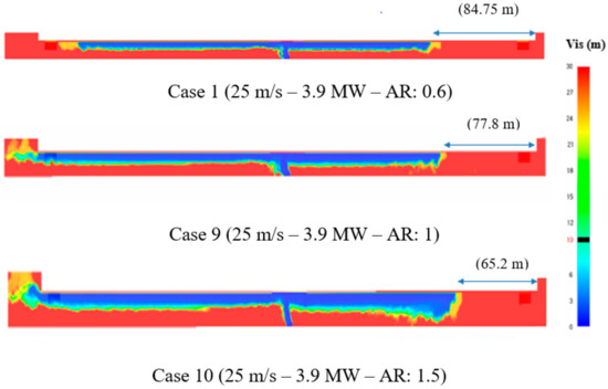 For case 1 in Figure 11, the velocity of the jet fan was 25 m/s, and the smoke movement was completely different between the left side and right side. In this case, the smoke tended to move to the left side (exit direction). As, in case 1, the jet fan operated with a high velocity, thus there was a tremendous flow rate of the air-entrained inside the tunnel. Therefore, it pushed the smoke to move to the exit direction. The heat release rate was 3.9 MW; thus, the amount of smoke was not high. However, when increasing the aspect ratio, the smoke could move outside quickly. In the region near the entrance, due to the effect of the jet fan, stratification occurred with the largest aspect ratio (case 10). The visibility was lower when compared with other cases, and as a result, it was difficult for the evacuation to proceed.