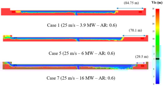 First, the value of the jet fan speed was fixed at 25 m/s, the aspect ratio was 0.6 and the heat release rate was changed. The smoke movement in these cases on the tunnel center’s plane is shown in Figure 8. In case 1, the velocity of the jet fan was 25 m/s (100%), and the smoke movement was totally different between the left side and right side. The smoke tended to move to the left side (exit direction). As, in this case, the jet fan operated with a high velocity, there was a significant amount of flow rate of the air coming inside the tunnel from the entrance. Therefore, it pushed the smoke to move to the exit direction. Moreover, the heat release rate was 3.9 MW, thus the amount of smoke was not high. However, when increasing the heat release rate, the amount of smoke was more significant. In case 7, with a 16 MW heat release rate, the smoke moved in both directions. In the region near the entrance, due to the effect of a jet fan, stratification occurred. The visibility was lower when compared with other cases, as a result, and it was difficult for evacuation.