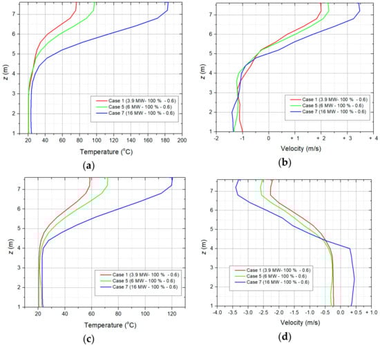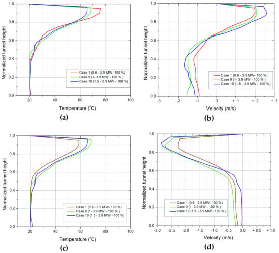 In Figure 10a at the upper part, the larger the heat release rate was, the higher the temperature was. Besides, the velocity was also larger when the heat release rate was larger. In the lower part, because all flow was air so that the absolute velocity value of case 1 (lowest heat release rate) was lower than other cases. When the heat release rate was low, it means the amount of air needed for fire combustion was also lower, so that the air coming inside the tunnel was low (case 1), and the smoke movement was quite weak when compared with other cases. However, with a higher heat release rate, the amount of air needed for the combustion process was larger and the smoke generated by the combustion process was also larger, so the velocity value, in this case, was greater than in other cases.