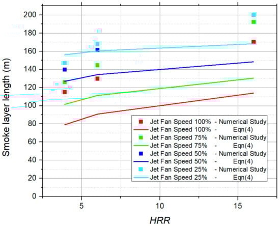 As shown in the previous sections, when increasing the heat release rate, the smoke layer length was also increased. The reason for this is that when the heat release rate of fire was larger, the amount of smoke generated was also higher. This caused the smoke to move quickly, so the smoke layer length was also increased. In contrast, when the jet fan speed was increased, the smoke layer length was decreased.