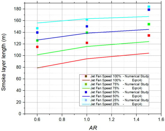 The smoke back layer length in the correlation between the heat release rate and jet fan speed is shown in Figure 13, the dots represent the results obtained by numerical study, and the line is the results from Equation (4). The figure shows that when increasing the heat release rate, the smoke layer length was also increased for both the numerical study and Equation (4). The reason is that when the heat release rate of fire was larger, the amount of smoke generated was also higher, it tended to cause the smoke to move quickly, the result was that the smoke layer length was also increased. In contrast, when the jet fan speed increased, the smoke layer length decreased, as this depends on a large amount of air that has been transported at high speed. Similarly, in Figure 14, when increasing the aspect ratio, the smoke layer length was also increased for both the numerical study and Equation (4), because when the aspect ratio was larger, it means the height of the tunnel was higher. For that reason, the smoke affected by buoyancy force led to the smoke movement being larger and the smoke layer length being longer, obviously. In this figure, the effect of the jet fan speed on the smoke layer length was also the same as the previous figure. The higher the jet fan speed was, the shorter the smoke layer length was. In Equation (4), there are some coefficients representing the temperature and velocity attenuation. Besides, because the two jet fans operated, it caused discrepancy in the coefficient. For that reason, the results had a little bit of error between the equation and numerical study. The future work will be investigated to find out that correction.