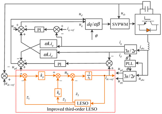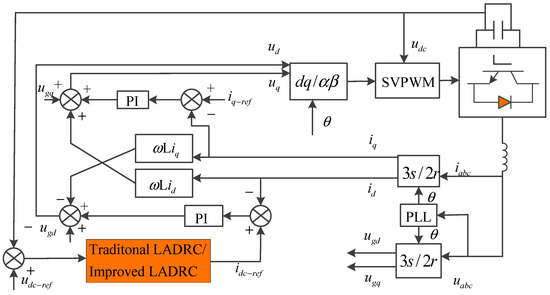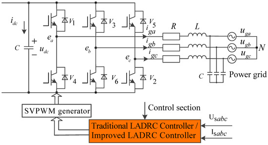 The overall control structure of the grid-side inverter of the energy storage system [16] is shown in Figure 1, where is representative of the voltage of the DC side bus and is the current through the DC bus capacitor; is the internal resistance of the filter inductance, is the filter inductance and is the filter capacitance; , and are representative of the three-phase grid voltage; , and are the output current of the inverter, respectively; are wholly controlled switching devices Insulated Gate Bipolar Transistors (IGBTs) on the six bridge arms of the inverter. , , and are AC output voltages of the converter; depict three-phase voltage at the inverter side and output side, and is the three-phase current output. The control structure of grid-connected inverter has two parts: the Space Vector Pulse Width Modulation (SVPWM) hardware layer, and the control layer, which control methods are traditional Linear Active Disturbance Rejection Control (LADRC) and improved LADRC.