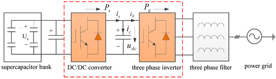 In recent years, due to the needs of renewable energy and smart grid construction, power storage technology, as a new regulatory means, has been highly valued because of its flexible control and convenient use [1,2]. At this stage, with the continuous installation of large-capacity equipment into the network, the stable grid connection of energy storage systems is also critical [3,4]. In energy storage systems, energy transmission, power balance, and stability of the DC bus voltage are the key links of the system grid connection [5]. As the DC link voltage is an intermediate link for energy transmission and conversion of the energy storage grid-connected system, its stability directly affects whether the system-side converter and the grid-side converter can achieve independent control, but also directly affects whether the system can operate safely and stably. Therefore, the design of grid-connected inverter control system is the core of the whole grid-connected system. Grid-connected inverter is a power electronic converter to realize DC-AC conversion, and it is the core device to connect the system and power grid [6]. In many energy storage equipment, the super-capacitor has become the leader of energy storage system, whether in the field of power suppression or low-voltage ride-through, it has demonstrated its unique advantages [7].