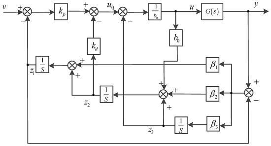 Equations (13), (14) and (15) constitute the structural block diagram of LADRC of system Equation (11), as shown in Figure 4: