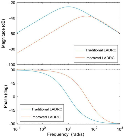 According to Equation (27), although does not affect the overshoot, it will affect the tracking speed of LESO. The larger is, the faster the system response is. Therefore, in order to improve the tracking speed, it is more likely to improve the . However, in the actual system, the size of is limited by the observation noise, and the increase of will also make the observation noise amplified, which will affect the control performance of the whole controller. Therefore, it is necessary to improve the traditional LADRC so that when increases, the effect of the observation noise on the system is relatively small.