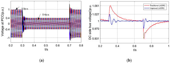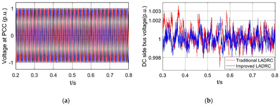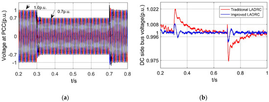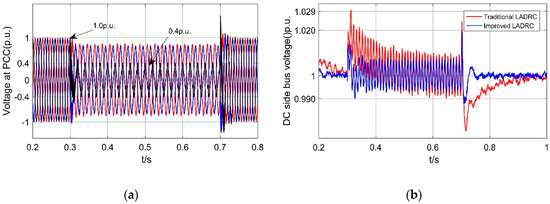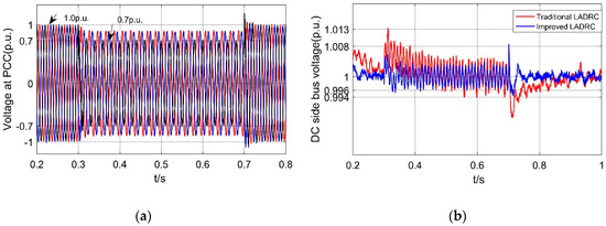 It can be seen from Figure 15b that the fluctuation range of the DC bus voltage controlled by traditional LADRC is 0.996p.u.–1.022p.u. during the low-voltage ride-through of 0.3p.u., while the fluctuation range of the bus voltage controlled by improved LADRC is 0.996p.u.–1.008p.u., and it can quickly reach the stable state of 1.0p.u. By comparison, improved LADRC control can promote the stability of DC bus voltage under disturbance, which shows that improved LADRC has better anti-interference performance.
