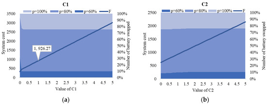 - The optimal result of battery type performance stability with varying values of , , and is shown in Figure 8. The varying value of can change the optimal strategy significantly, as shown in Figure 8d,e. The increased value of would result in an increased number of vehicles holding more residual energy at the destination.