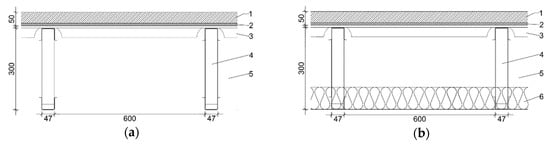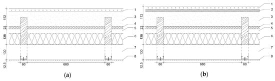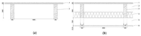 Cross-sections of model 1a (a) and 1b (b) of the wooden frame floor. 1–OSB board, 2–air gap, 3–wooden joints, 4–mineral wool ρ = 12 kg/m3, 5–air gap, 6–plaster board.