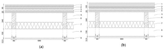 Cross-sections of model 1c (a) and 1d (b) of the wooden frame floor. 1–self-leveling screed, 2–mineral wool ρ = 150 kg/m3, 3–mineral wool ρ = 107 kg/m3, 4–OSB board, 5–air gap, 6–wooden joints, 7–mineral wool ρ = 12 kg/m3, 8–air gap, 9–plaster board.