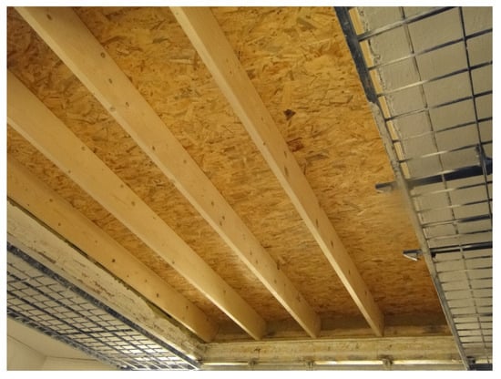 Six different models of wood frame floors and four models of metal floors were investigated. All had the same dimensions of 4230 mm × 2740 mm and were installed successively in the same horizontal opening of the test facility. The basic structure of the wooden floor (model 1a in Figure 1) was made of 60 mm × 240 mm joists spaced at a distance of 680 mm. The upper deck consisted of 22 mm OSB panels with a density of 625 kg/m3 screwed directly to the joists (Figure 4). Model 1b was constructed as a modified version of model 1a; the space between joists was filled with mineral wool with a density of 12 kg/m3, 100 mm thick, which was secured in place with a grid made of wire forming a 140 mm plenum. Then, a suspended ceiling made of 12.5 mm plasterboard panels (815 kg/m3), attached to horizontal aluminum channels, was attached to the main joists using 130 mm elastic hangers (model 1b in Figure 1).
