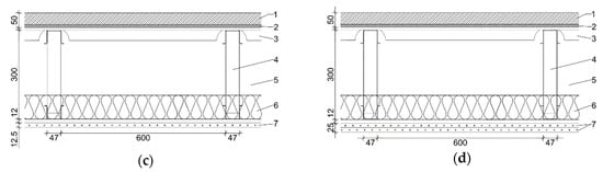 Cross-sections of a metal frame floor: (a) Basic construction (model 2a); (b) Construction filled with a glass wool (model 2b); (c) Construction with a single plasterboard (model 2c); (d) Construction with a double plasterboard. 1 – concrete slab, 2 – wood-fiber insulating board, 3 – profiled sheet, 4 – steel trusses, 5 – air gap, 6 – glass wool ρ = 12 kg/m3, 7 – plasterboard.