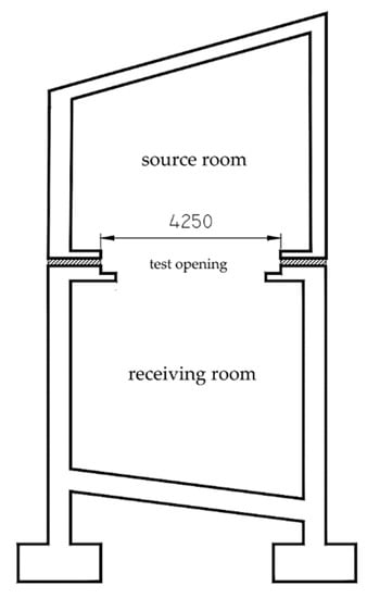 Airborne and impact sound insulation measurements were carried out in accordance with EN ISO 10140. Single number values were calculated according to EN ISO 717-1 and EN ISO 717-2 respectively. Two wideband speaker cabinets placed in the corners of the sending room were used as airborne sources emitting pink noise. The impact sound insulation was determined with the use of a standard tapping machine placed successively at five different positions on the floor, in accordance with the standard’s recommendations. Average sound pressure levels in 1/3 octave bands were measured in the source and in the receiving room. Continuously moving microphones were used for the space averaging; the sound pressure level was integrated over time and space. Reverberation time was determined in the receiving room to enable the calculation of sound reduction index R, as well as the normalized impact sound pressure level, Ln. The source and receiving rooms were of irregular shape with no parallel walls and were separated by a structural acoustic break (Figure 6).