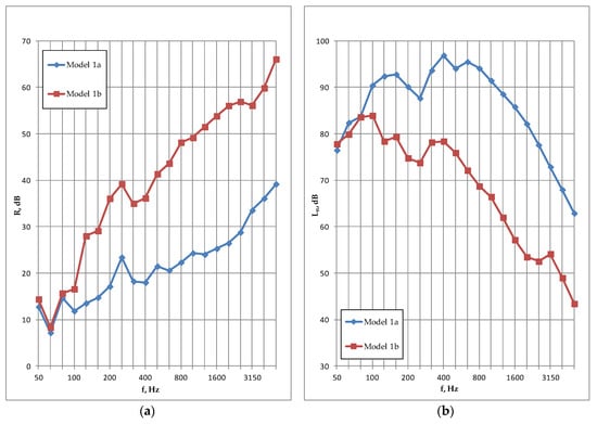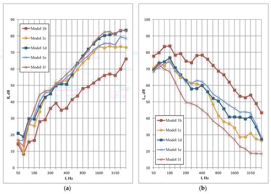 The results of laboratory measurements conducted for the basic structure of a wooden floor (model 1a) and a floor with a suspended ceiling (model 1b) are presented in Figure 7. The single number values of airborne and impact sound insulation are collected in Table 5. The acoustic performance of a bare floor was not satisfactory and did not meet any legal requirements or the expectations of the users. The application of a suspended ceiling increased the values of airborne single number quantities by about 20 dB. A similar improvement of impact sound insulation was also noticed. The low frequency enhancement, however, measured by employing C50–5000 and CI,50–3150 spectrum adaptation terms for the assessment, was lower by 4–5 dB. The results were not satisfactory even for users with very low expectations [].