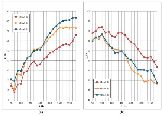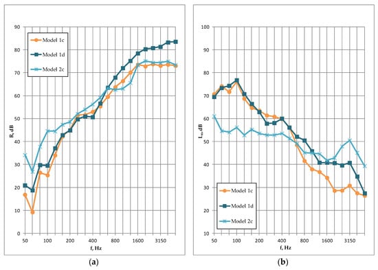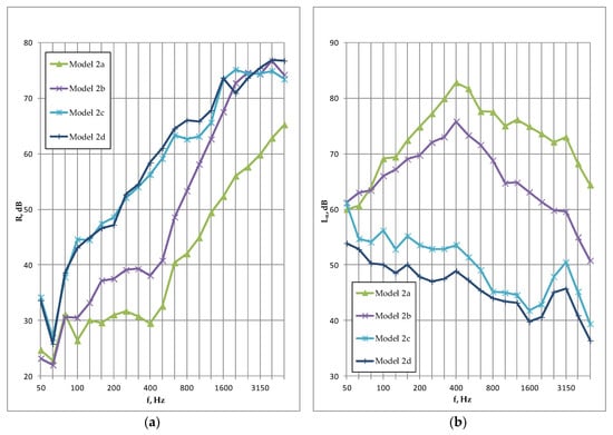 The application of a suspended ceiling, which closed the floor structure on the bottom side (models 2c and 2d), changed the shape of the airborne sound insulation curves considerably. This is typical of a double lightweight frame structure with a boarding fastened on both sides to different, structurally separated parts of the frame. Airborne sound insulation improved mainly in the low and middle frequency bands, whereas impact sound insulation increased in a significantly wider range, also including high frequencies. The decrease observed at 400 Hz in the case of models 2a and 2b essentially disappeared; however, it is still slightly evident in the impact sound insulation plots (Figure 11b). In the case of models 2c and 2d, a distinctive increase of impact sound pressure level also appeared at 3150 Hz. This is related to the coincidence effect of the plasterboard panels [,,].
