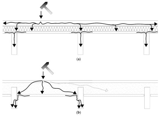 Structural paths of sound transmission in the case of: (a) Heavy floating floor with a concrete slab on the top; (b) Lightweight floating floor built with dry-screed boards and expanded clay aggregate.