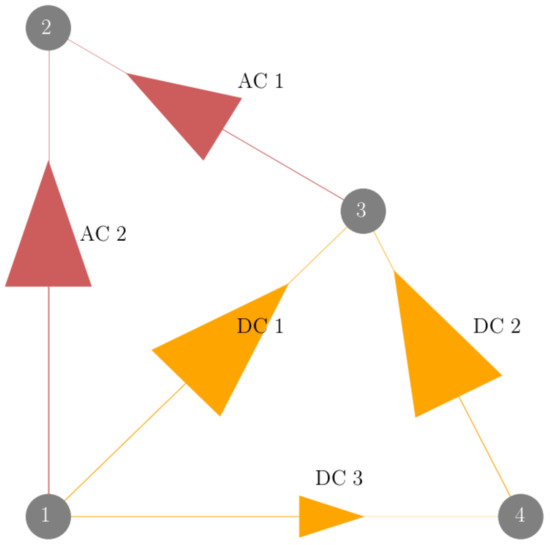 In Figure 1, we give a short example of DC lines embedded in cycles in a network with N = 4, L = 2 and L = 3. The pseudo-impedance in Equation (28) results directly from the first four quantities, namely the incidence matrix, the flow, the injection, and the reactance. The arrow sizes in Figure 1 are proportionally set to the corresponding flows.