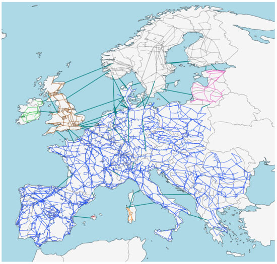 The European power system comprises five synchronous zones of heterogeneous sizes and covers the whole European Network of Transmission System Operators for Electricity (ENTSO-E) area. As displayed in Figure 3, these zones comprise the synchronous grid of Continental Europe (blue), representing the largest with 24 countries, the North of Europe (gray), the Baltic States (pink), the United Kingdom (brown), Ireland (light green), Mallorca (red), and Sardinia (orange). They are interconnected by HVDC lines in dark green. The data for the figure is retrieved from the interactive ENTSO-E transmission system map [18].