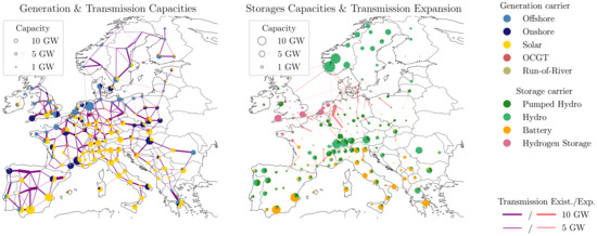 - Hörsch, J.; Hofmann, F.; Schlachtberger, D.; Brown, T. PyPSA-Eur: An open optimisation model of the European transmission system. Energy Strat. Rev. 2018, 22, 207–215. [Google Scholar] [CrossRef]