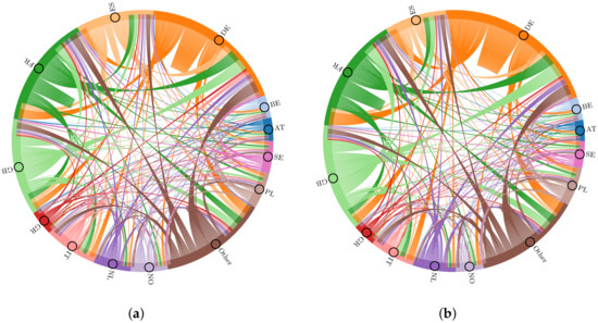 Figure 5a shows the average source-sink allocation, given by , aggregated to countries. Colors of the outer circle indicate the overall exchange of the considered country. Colors of the inner circle and inbound connections represent either exports of the country (same color as the outer circle) or imports from other countries (corresponding colors of other countries in the outer circle). Self-assigned allocations are connections with the country itself, as one can clearly see, for instance, for Germany. The allocated cross border flows (CBF) are dominated by large exporters and importers in the system. Therefore, only 12 countries with the largest cross border exchange are represented separately, whereas the remaining countries are aggregated as “Other”. In the cost-optimized setup, Germany, France, and the United Kingdom are the strongest exporters and importers. However, there are countries with a much higher export-import ratio, such as Greece or Netherlands. Note that, by definition of the peer-to-peer relations for both methods, Equation (18) does not takes geographical distance into account and thus leads to large-distance exchanges, e.g., Germany–Spain or Finland–Italy. However, neighboring countries disclose the strongest interconnections. This applies particularly to countries along the North Sea coast where transmission expansion allows for strong interactions. Moreover, optimizing the cost of capacity expansion and disposition may lead to more installation and generation in regions near load centers. The FA methods now allow one to further break down the cross border flow allocation. Figure 5b shows the same setup but only includes power transfers induced by wind power injection. Remarkably, the country-to-country allocation hardly changes, as the overall CBF allocation is mainly driven by countries with strong wind production. Indeed, CBF induced by wind power covers 69% of the total CBF.