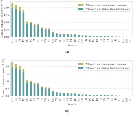 In Figure 6a,b, the average induced transmission for each country is shown. Each bar is split according to the two categories. First of all, it is remarkable how similar EBE and MP correlate on the aggregated country level. Despite strong absolute differences, the relative proportions are almost the same. The strongest transmission grid users are Great Britain, France, Germany, and Spain, followed by Norway after a large gap. More or less similar are the usages of transmission expansion distributed. Thus, even though Great Britain is not the strongest power exporter or importer, it has the highest average share of flows in the system. This indicates that, due to its topological situation and injection behavior, its power exports and imports are, on average, of longer spatial distance, which pushes the usage of the original and expanded transmission grid.