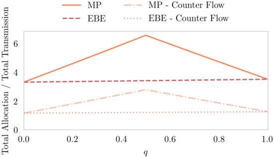 Finally, we close with a short discussion about higher absolute flow contributions in the MP allocation compared to EBEs. As pointed out earlier, with the 50–50% split, the MP algorithm leads to effective flows from net producer to net producer. This leads to higher shares of counter flows in the allocation, which on the other hand have to be balanced according to Equation 7. Figure 7 shows the ratio between the sum of absolute allocated flows and the total transmission as a function of q. Indeed, in the realm , the MP method allocates much more flow, peaking at q = 0.5 with more than six times the total transmitted power, whereas the EBE method stays steadily at around three times the total transmission. The two lower lines reflect the sum of all allocated counter-flows which, as to expect, lays 0.5 below the half of the absolute allocation sums. In other words, each counter-flow cancels out with an aligned flow, and the remaining aligned flows sum up to .
