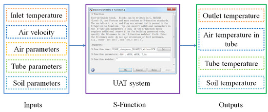 In order to investigate the multivariant impacts on the outlet temperature and cooling capacity of the UAT system, parametrical analysis has been conducted on inlet air temperatures, air velocities, and design parameters (e.g., tube depth, diameter, length, material, and wall thickness) using an experimentally calibrated mathematical model. In the mathematical model of the UAT system, the heat conduction was modelled to dynamically calculate the heat transfer within the underground soil. Convective heat-transfer processes along the air flow direction were modelled for the heat exchange between two adjacent air layers and between the flowing air and tube. Multidimensional matrices were developed for different heat exchange mediums, following the principle of energy balance. The multidimensional matrices were programmed in MATLAB language, and then, a block was built for each parameter calculation of thermal performance through the SIMULINK platform using the S-Function, as shown in Figure 1. The S-Function block can expand the function of the SIMULINK platform by computing a subroutine using various programming languages (e.g., MATLAB, C, C++, or Fortran), which can request the input variables for the generation of output results. The developed block can be used to dynamically predict the air, tube, and soil temperature during the continuous operation process.