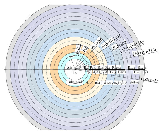 In this system, the model of air, tube wall, and soil along the flowing air direction can be split into n volume elements and the distance between two-adjacent divided layers is denoted as Δx, as shown in Figure 2. The temperature of each layer is assumed to be the same as the discretized node. Each divided element follows the energy balance law. The energy balance equation of each volume element can be solved at each time step to iteratively calculate the temperature variation. In the mathematical model, the temperatures of each node at time t and the previous time are denoted as and . The linear mean temperature was adopted for the temperature between time t-dt and t [44]. Based on this, the nodal discretization of the air, tube, and soil located at the jth layer can be illustrated in Figure 3.
