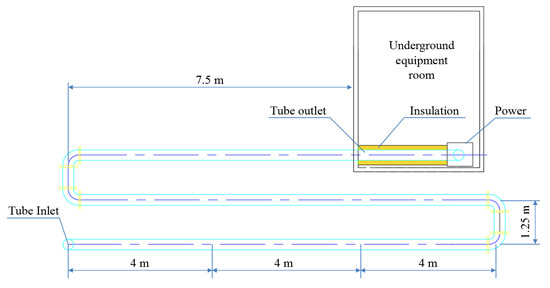 The prediction accuracy of the developed dynamic model was compared with the experimental results. The experimental platform of the UAT system was built in Changsha, China. The UAT system consisted of a power equipment and S-shaped buried tube with a depth of 3.5 m and a total length of 34 m. The tube was made of polyethylene (PE) with a diameter of 250 mm and wall thickness of 10 mm. The sensors are PT 100 thermocouple with a permissible error at ± 0.15 °C. All these sensors were calibrated using the ice-water mixture before being connected to the Agilent 34972A for the experimental testing. The airflow velocity in buried tube was measured using the vane probe type anemometer (TSI-9555) with an accuracy of ±3.0%. The schematic diagram of UAT system are presented in Figure 4. The input parameters used for the dynamic model validation are listed in Table 1.