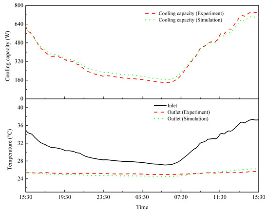 Figure 5 shows the comparison results between the experimental testing and simulated results for outlet air temperature and cooling capacity in summer. As shown in Figure 5, the dynamic model-driven outlet temperature shows a similar trend to the monitored temperature from 15:30 to 7:30, whereas the dynamic model-driven outlet temperature shows a higher increasing trend than the experimental results. The temperature rise of the outlet air temperature is 0.61 °C for the experimental results, and the temperature rise is 1.43 °C for the simulated results. The underlying mechanism is due to the testing errors, resulting from the PT 100 thermocouple and the vane probe type anemometer. Furthermore, the maximum temperature difference between the monitored and simulated air temperature at the outlet is less than 0.81 °C. The corresponding average temperature difference is less than 0.13 °C. Furthermore, the maximum absolute relative deviation (MARE, as shown in Equation (22) [47]) between the monitored and simulated results for the air temperature at the outlet is approximately 3.18%.