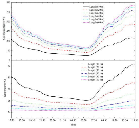 The effect of the tube length on the outlet temperature and cooling capacity was investigated, with the air velocity at 1 m/s and tube inner diameter at 250 mm. Other variables, e.g., inlet air temperatures, tube conductivities, and soil parameters, are kept constant.