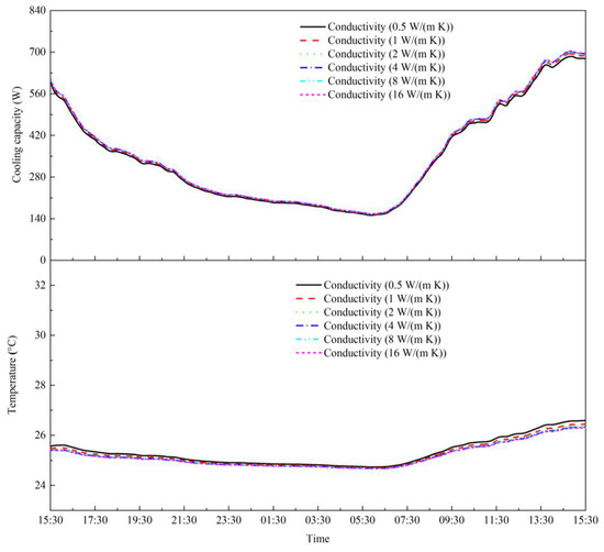 Based on Equation (21), the maximum cooling capacity between the monitored and simulated results can be calculated as 39.59 W and the corresponding average cooling capacity difference is 8.90 W. Furthermore, the maximum absolute relative deviation between the monitored and simulated results for the cooling capacity can be calculated as 6.03%. According to the above comparison results, the developed dynamic model is accurate to further investigate the dynamic thermal performance for multidimensional parameter analysis.