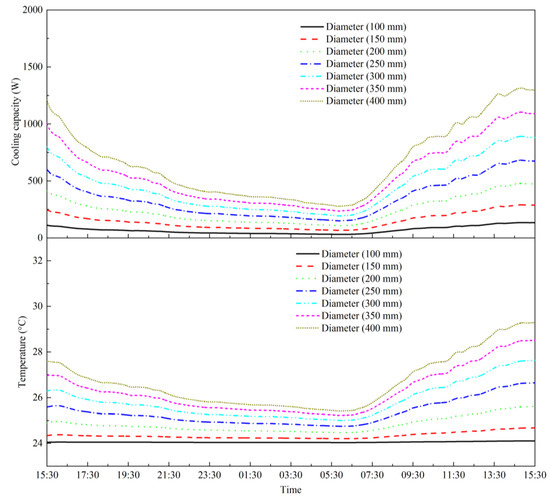 Figure 6 shows the impacts of the tube lengths on the cooling capacity and outlet temperature. The average outlet temperatures and cooling capacities are presented in Table 2. As shown in Figure 6 and Table 2, when the tube length is 10 m, the UAT system shows the highest outlet temperature at 28.15 °C and the lowest cooling capacity at 163.29 W. With respect to the increase of the tube length from 10 to 60 m, the outlet temperature decreases from 28.15 °C to 24.40 °C and the cooling capacity increases from 163.29 to 401.95 W. The underlying mechanism is that a longer tube length can enhance the heat exchange between the flowing air and surrounding soil due to the increased time-duration of flowing air in the tube. However, as shown in Figure 6, with the increase of the tube length, the decreasing magnitude of the outlet temperature and the increasing magnitude of the cooling capacity decrease. For instance, when the tube length increases from 10 to 20 m, the decreasing magnitude of the outlet temperature is 1.57 °C and the increasing magnitude of the cooling capacity is 100.15 W. However, when the tube length increases from 50 to 60 m, the decreasing magnitude of the outlet temperature is only 0.23 °C and the increasing magnitude of the cooling capacity is 14.83 W. The underlying mechanism is that, as the decreasing magnitude of the soil temperature decreases with the increase of the tube length, the temperature difference between the flowing air and surrounding soil temperature will be saturated. By contrast, from the perspective of the initial economic investment, the increase of the buried tube length will significantly increase the initial, operational, and maintenance costs due to the difficulties in the system installation and operation processes. Therefore, when systematically considering the outlet temperature, the cooling capacity, and economic performance, the solution for the increase of the buried tube length is not techno-economically competitive, especially with the increase of the buried tube length.
