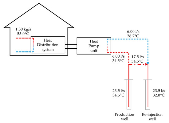 A water flow of 6.00 out of 23.5 L/s was computed as sufficient to heat the considered schools (about 160 kW). The remainder is supposed to be by-passed and then mixed again to reinject the entire flow rate through a reinjection well [56]. A scheme describing the operation of the system is shown in Figure 1.