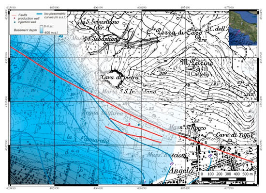 This is at SW of Mt. Massico, which is a carbonate monocline trending SW bounded by high-angle normal faults along the margins of the Garigliano (NW), Volturno (SE), and Mondragone (SW) plains. These faults, several kilometers deep, have a throw estimated to be hundreds of meters [57,58,59]. Recent geophysical data have provided information about the bedrock of Mondragone plain. It is made by limestone and marly-arenaceous rocks and affected by several faults. The most important fault of this area crosses the whole plain from NW to SE and it is here coupled to other sub-parallel faults. The carbonate bedrock near Mt. Petrino has been found at a depth of –30 m below ground level (b.g.l.), under pyroclastic-alluvial deposits. From this zone, moving towards SE, the bedrock shows instead a regular depth towards the sea [1] (Figure 2).