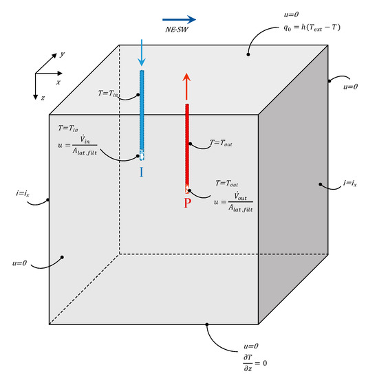 The Darcy’s flow model is coupled with heat transport in a porous medium to study the temperature distribution under geothermal exploitation. In the heat transport equation, the local thermal equilibrium between the solid and fluid phases is considered. Therefore, the solid temperature, Ts, is equal to the fluid temperature, Tf. Moreover, heat transport between solid and fluid phases is considered to be negligible. The heat transport in the subsurface is described as [64,65]